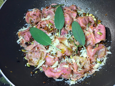 Espalhe algumas sementes de abóbora por cima, algumas folhas de sálvia fresca e regue tudo com um pouco de azeite. Leve ao forno até a abóbora estar macia. Quando a abóbora estiver assada, retire do forno e deixe esfriar um pouco. Comece então a picar, com a faca, os pedaços de abóbora assada com as sementes e juntamente com o raminho de orégãos e mais algumas folhas de sálvia fresca. A grande sacada desse recheio é não processar. Apenas picar bem com a faca, para que o recheio tenha uma certa textura.